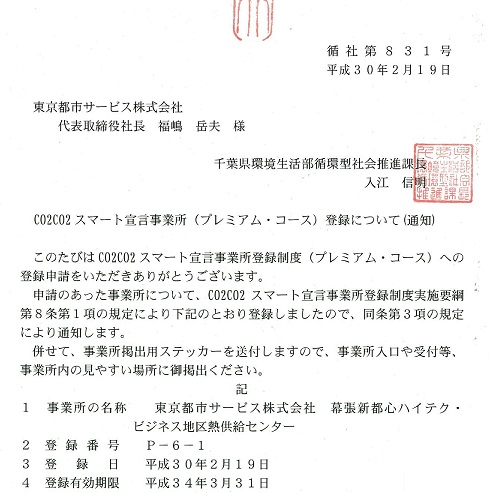このたび、当社の幕張新都心ハイテク・ビジネス地区熱供給センターが、2018年2月19日付で千葉県のCO2CO2(コツコツ)スマート宣言事業者(プレミアム・コース)に登録されました。